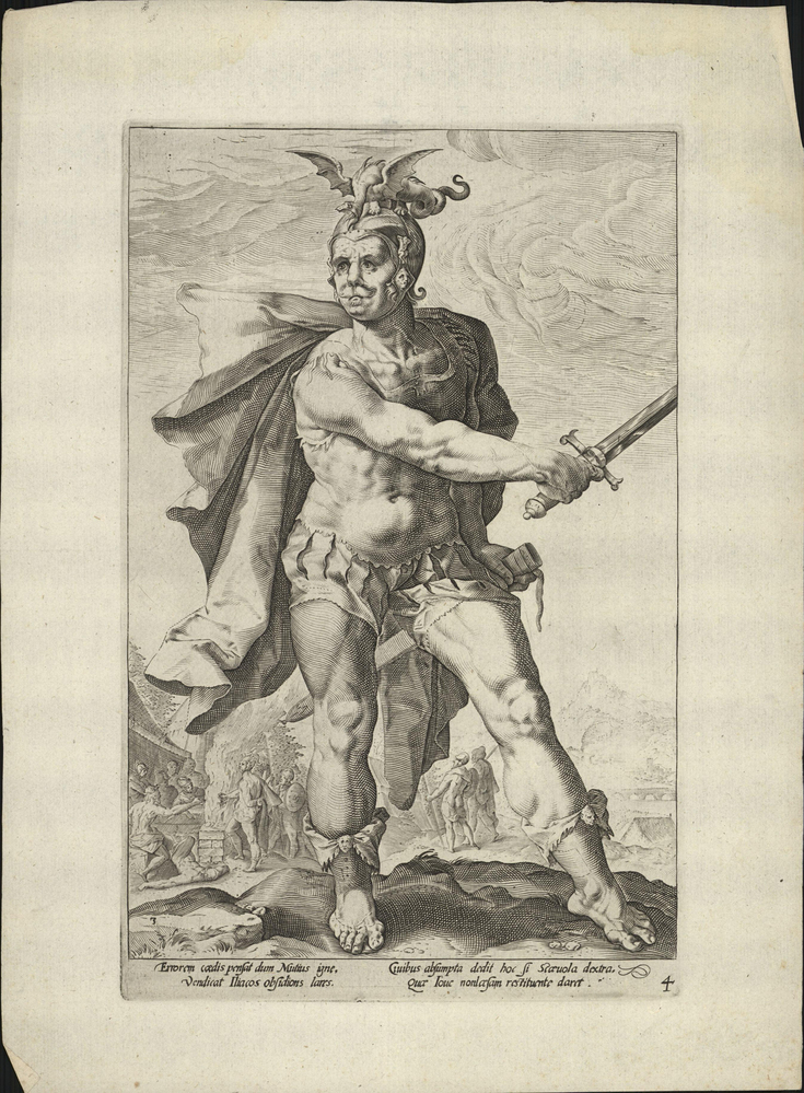 : Vertaling: Doordat Mucius met het vuur zijn moord op de verkeerde compenseert, bevrijdt hij de huizen van Trojes afstammelingen van het beleg. Als Scaevola voor zijn medeburgers dit al voor elkaar kreeg door zijn rechterhand te offeren, wat zou hij dan bereiken als Jupiter hem zonder geqonde hand zou teruggeven? [H. Leeflang, Hendrick Goltzius, tekeningen, prenten en schilderijen, 2003, pp. 90.]