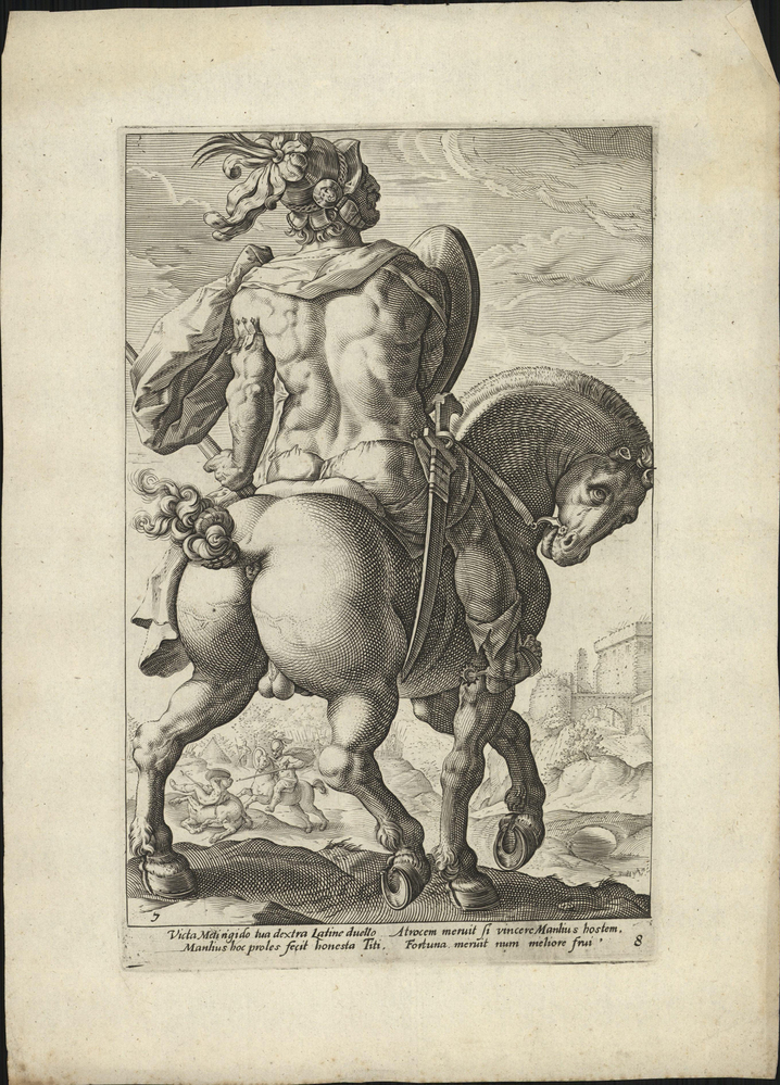 : Vertaling: Maecius, Latijn, uw hand in een bittere oorlog was overwonnen, en [..] Manlius, de roemrijke zoon van Titus, dit. Als Manlius het had verdiend de woeste vijand te overwinnen, had hij dan niet een beter lot verdiend? [H. Leeflang, Hendrick Goltzius, tekeningen, prenten en schilderijen, 2003, pp. 90.]