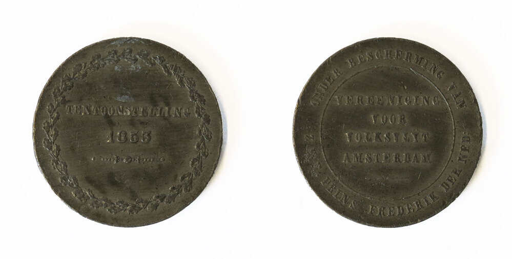 Tentoonstelling van bouwmaterialen van de Vereniging voor Volksvlijt te Amsterdam, 1853 tin hoogte: 2.7 cm; breedte: 2.7 cm; diepte: 0.2 cm; gewicht: 15.2 gr; opschrift voorzijde: tentoonstelling / 1853