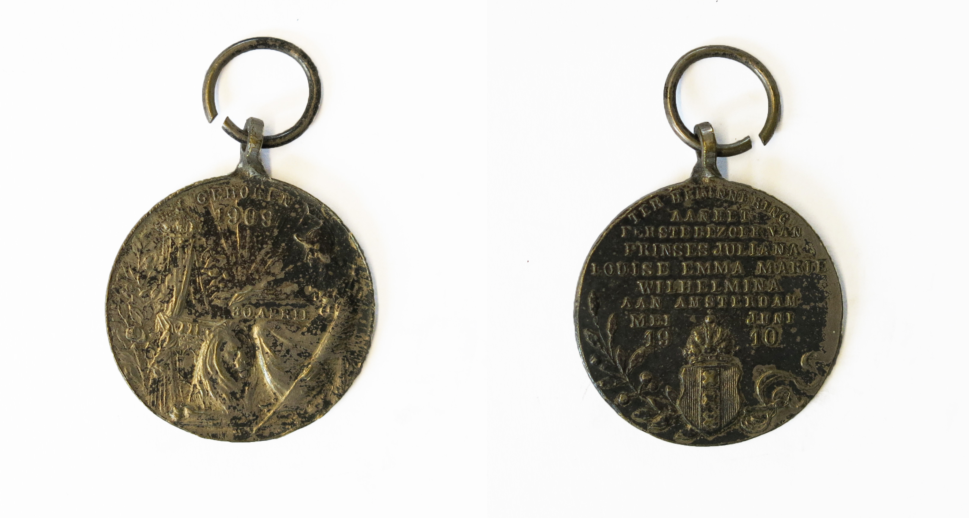 opschrift keerzijde: TER HERINERING AAN HET EERSTE BEZOEK VAN PRINSES JULIANA LOUISE EMMA MARIE WILHELMINA AAN AMSTERDAM MEI JUNI 1910
