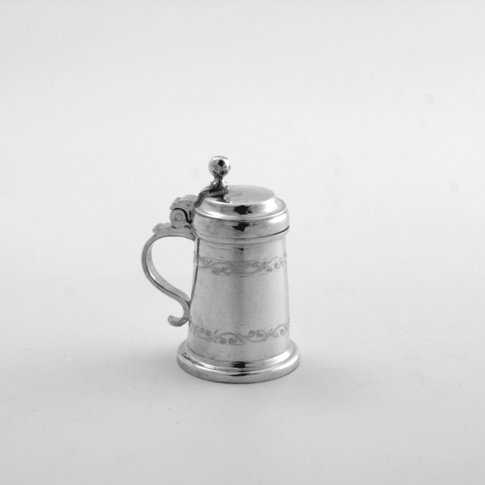 Ronde bierpul op verhoogde voetrand, gladde conische wand met twee bandgraveringen en scharnierend klapdeksel; glad met hoge sluitrand, knopvormige duimrust op S-vormig oor.