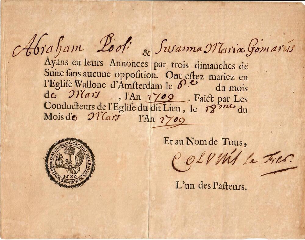 - Akte van ondertrouw van Abraham Pool en Susanna Maria Gomarús, verstrekt op 6 maart 1709, 1709