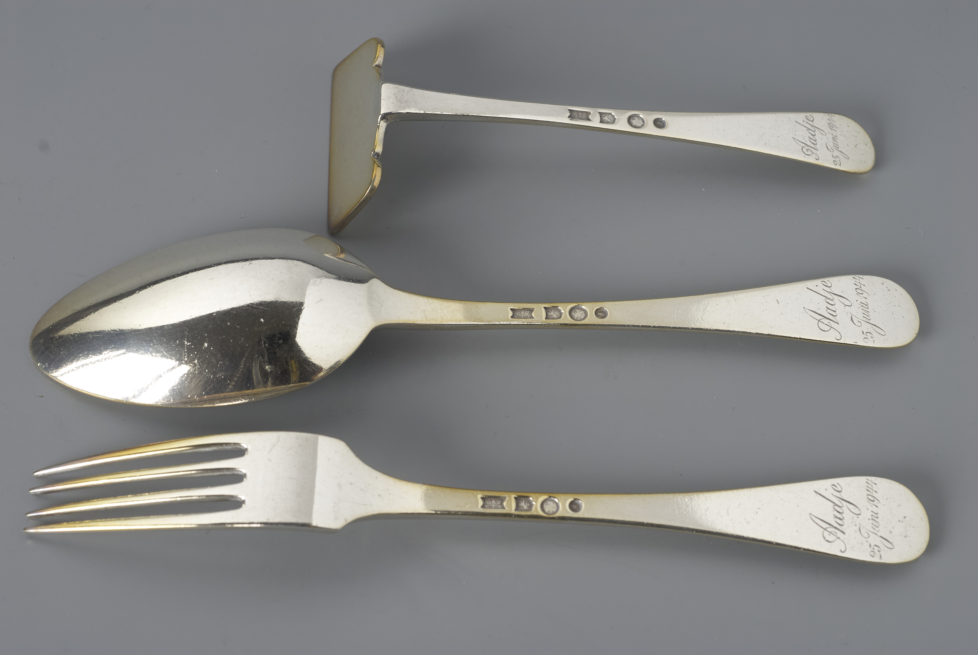 - Driedelig zilveren kinderbestek van Adrianus Bonebakker (1943-2002), gedoopt op 25 juni 1944., 1944