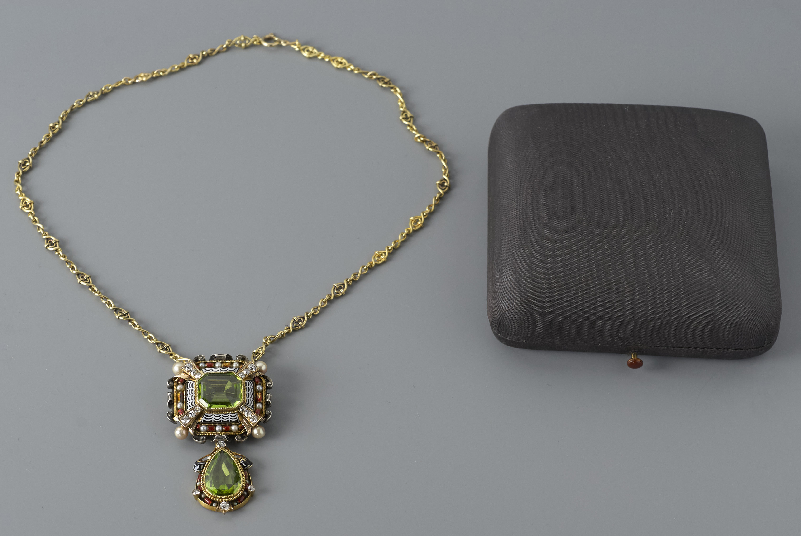 Hanger bestaande uit twee delen, bezet met een smaragd geslepen peridot, een druppel geslepen peridot en een entourage van briljant geslepen diamantjes, parels en email. In de stijl van Carlo Giuliano. In Bonebakker-etui, bekleed met donkerbruine zijde.- Keywords