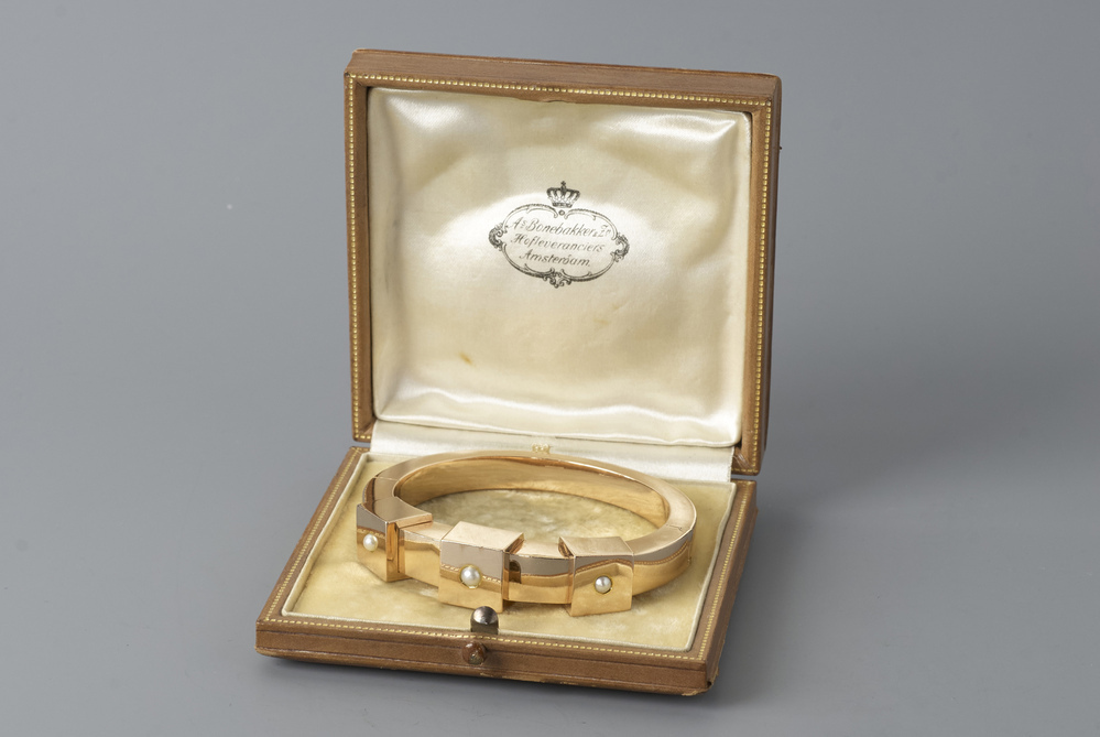 Geelgouden armband, bezet met drie parels. In originele As. Bonebakker & Zoon etui, bekleed met lichtbruin leer.- Trefwoorden