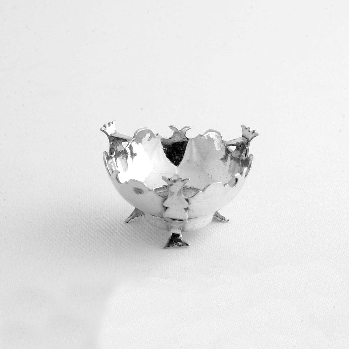 Komvormig lichaam met verdiepte bodem, staande op drie pootjes die doorlopen tot boven op de rand en dienen als steunen.