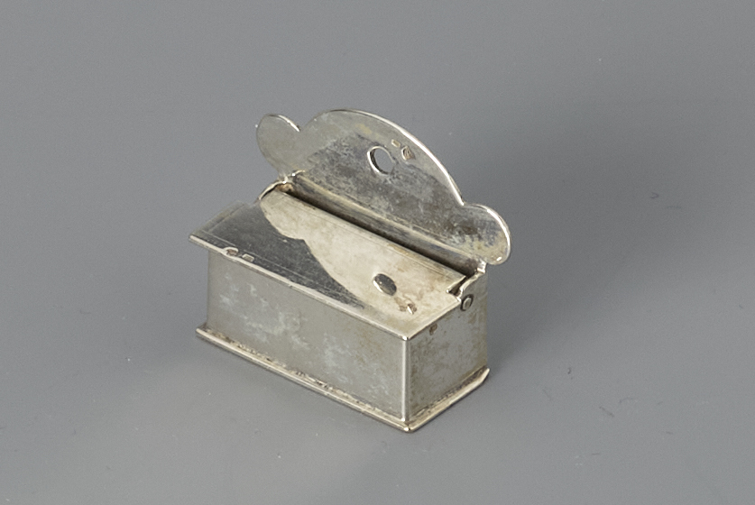 Rechthoekige bak met klep, de muurplaat verhoogd met ophangoog en hoog getoogd met twee oren.