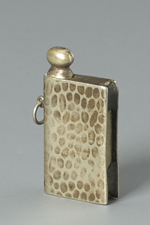 Boekvormig doosje met oogje op de rug en strijkstokje/houder op de bovenzijde in de band .- Trefwoorden