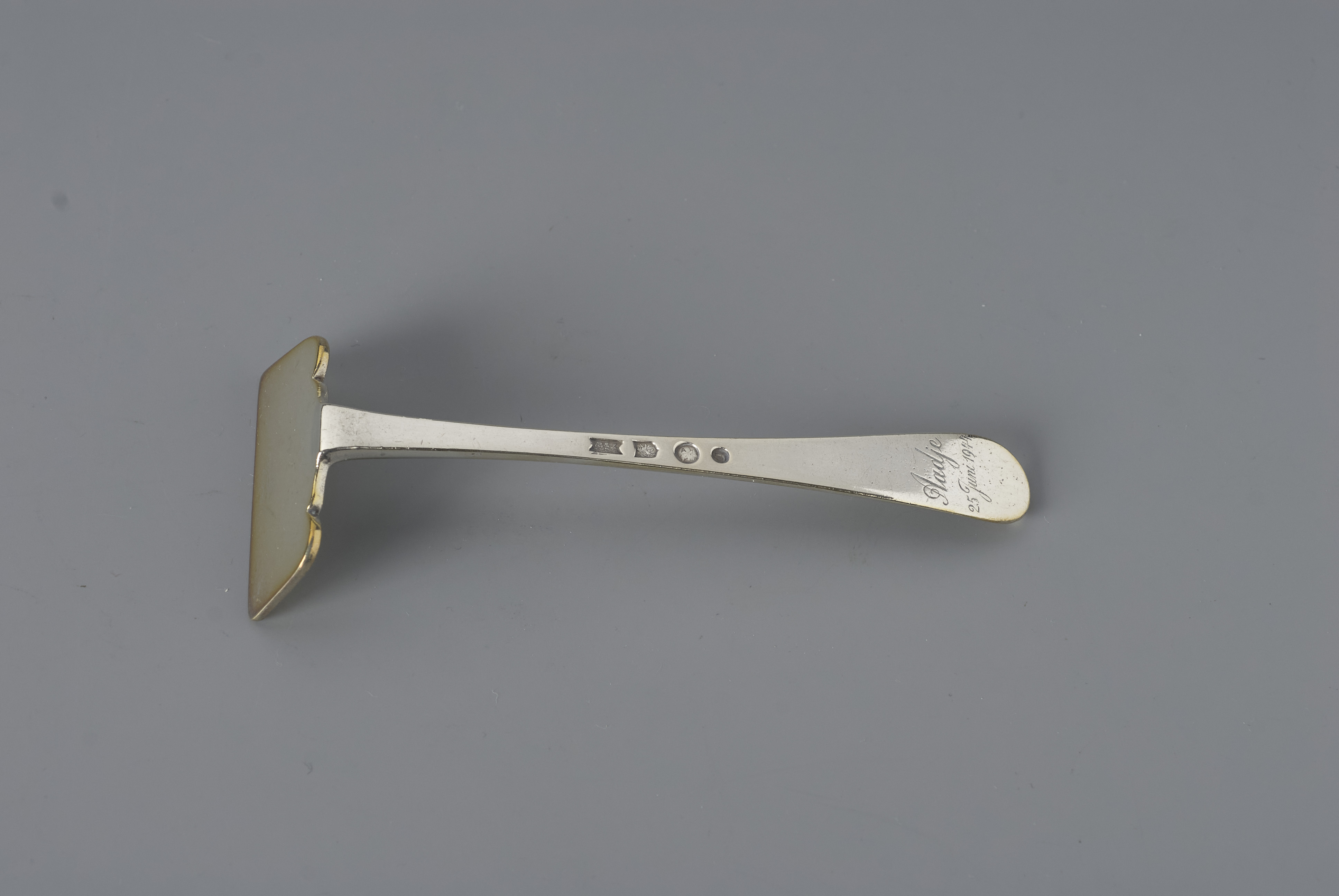 - Schuifje van driedelig zilveren kinderbestek van Adrianus Bonebakker (1943-2002), gedoopt op 25 juni 1944., 1944