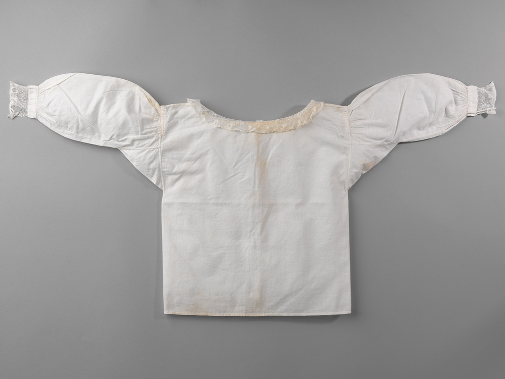 Hemdje met lange mouwen van wit katoen met kant langs de hals en mouw. Lage mouwinzet, met aangerimpelde mouwen. Sluiting middenachter met band. Voor een jongen. Initiaal: BB 6.