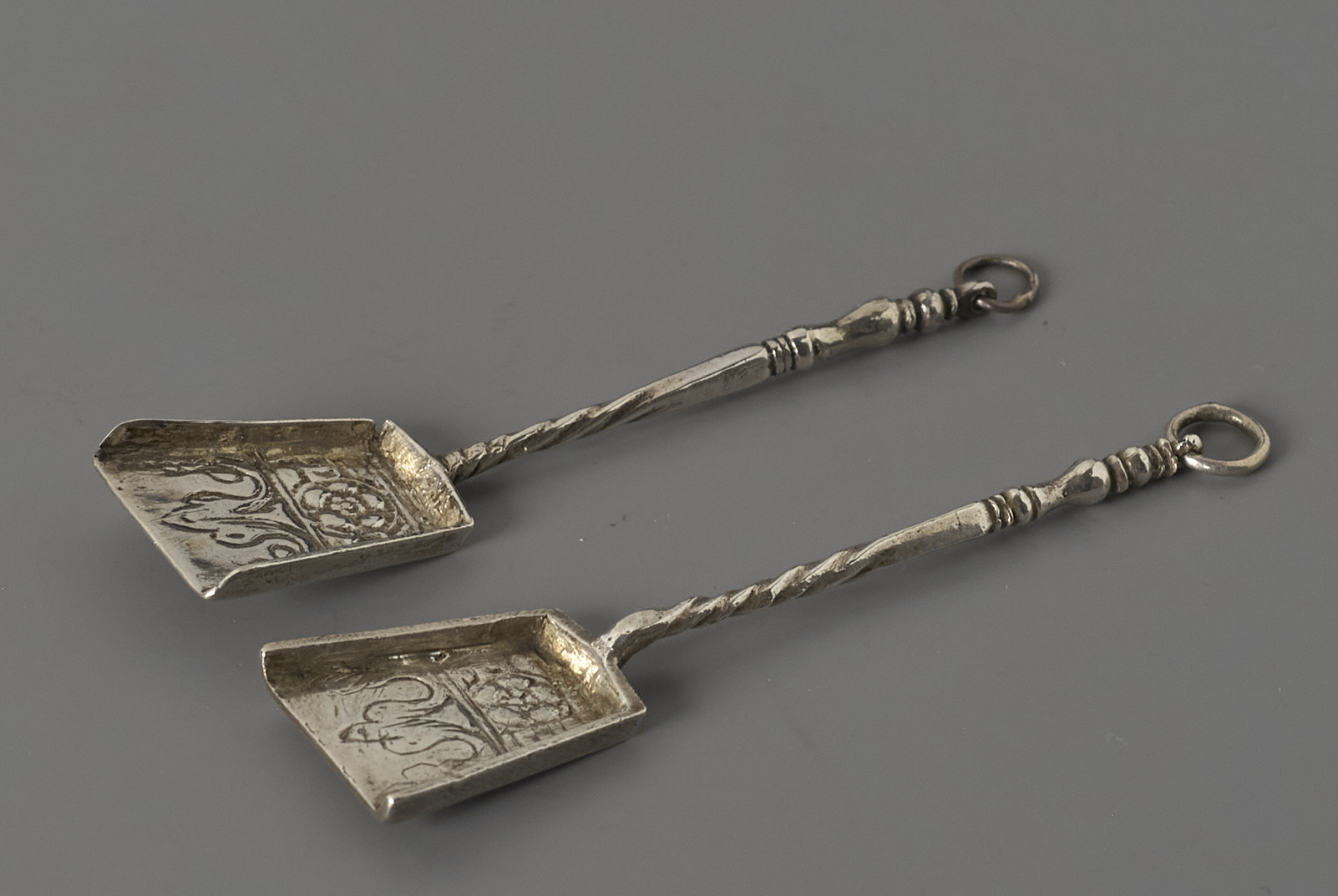 Haardschep met gedeeltelijk getorste schep, binnenkant schep versierd met renaissance motieven.- Trefwoorden