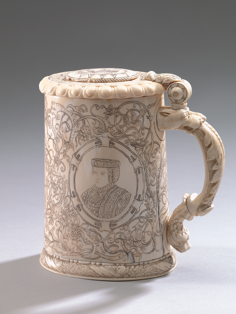 Bierkan met klepdeksel in oor, ovale doorsnee, bodem opgeschroefd. Gegraveerd met guirlandes, wapen, 2 portretmedaillons en renaissancemotieven. Greep met voluten en dierenkoppen gesneden. Deksel gegraveerd met staande leeuw. Het knopje ontbreekt.- Trefwoorden