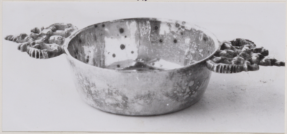 Ronde kom met licht gewelfde bodem en gladde hoge wand met twee ajour gegoten horizontaal aangezette oren tegen de bovenrand; licht gewelfd deksel met eenvoudige randgravering; dekselknop in de vorm van twee C-voluten tegen elkaar.