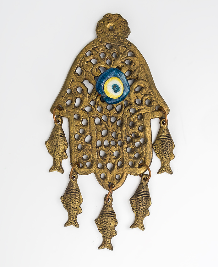 Messing hamsa amulet, opengewerkte hand met oog en vijf afhangende vissen.- Keywords
