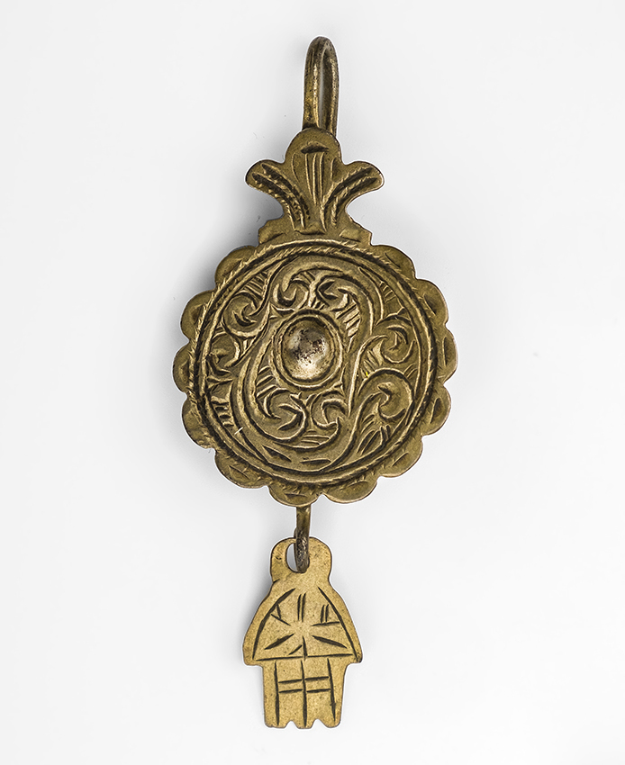 Messing hamsa amulet aan haakje, granaatappel met afhangend handje.