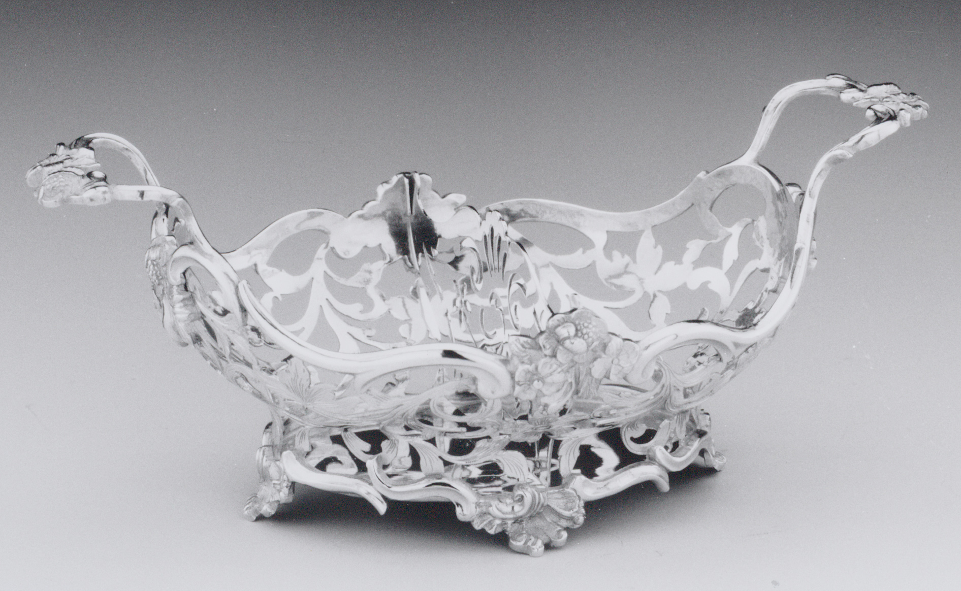 Ovaal mandje met vlakke bodem, gevat in onderrand, opgebouwd uit S-voluten. Rand onderbroken door vier gegoten en deels geciseleerde rocaillemotieven, tevens als pootjes dienend. Gewelfde wand, opengewerkt met bloem- en bladranken, de buitenzijde gegraveerd, de binnenzijde glad. Bovenrand, opgebouwd uit C- en S-voluten, onderbroken door vier deels geciseleerde bloemboeketjes. Korte zijden uitlopend in gebogen oren, samengesteld uit voluten en bloemtakjes. Uitneembaar opengewerkt tussenschot, vermoedelijk van later datum.