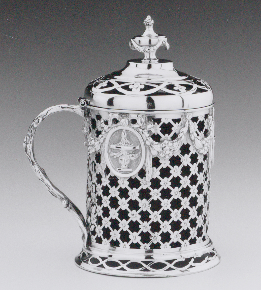 Deze mosterdpot toont de voor Wijnand Warneke karakteristieke mengeling van modestijlen die in het laatste kwart van de achttiende eeuw naast elkaar bestonden (Verbeek 1988, p. 83). Modern zijn de strakke cilindrische houder en de medaillons met de vazenreliëfs, uitgevoerd in Lodewijk XVI-stijl. Het omkrullende oor met de opgelegde ranken doet daarentegen ouderwets aan (vgl.: De Lorm 2001~2, p. 163-164 nr. 96, 97). Vaasvormige dekselknoppen als deze werden ook door Johannes Schiotling toegepast (Verbeek 1976, nr. 39, 47). Zie over mosterdpotten: Hofman 1985. ( Bert Vreeken)
