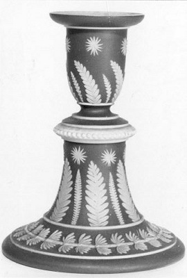 Vaasvormige kaashouder op korte schacht, ongeglazuurd, op diepblauw fond lichtblauw reliëf van palmetten, rand van waterplanten en sterren.- Trefwoorden