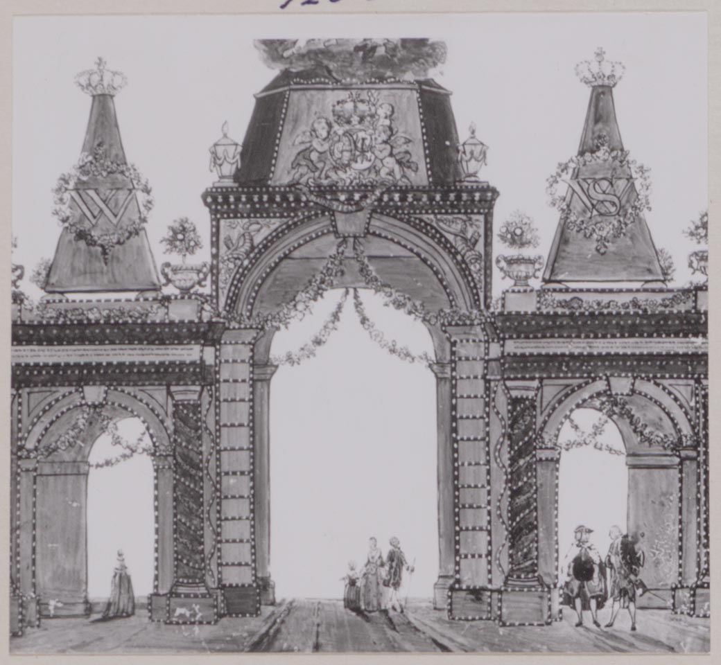 Twee beschilderde glasplaten, zonder lijst: 1. Erepoort met letters W en WS (= Stadhouder Willem V en Wilhelmina van Pruisen) 2. gebouw (Binnenhof Den Haag ?)- Trefwoorden
