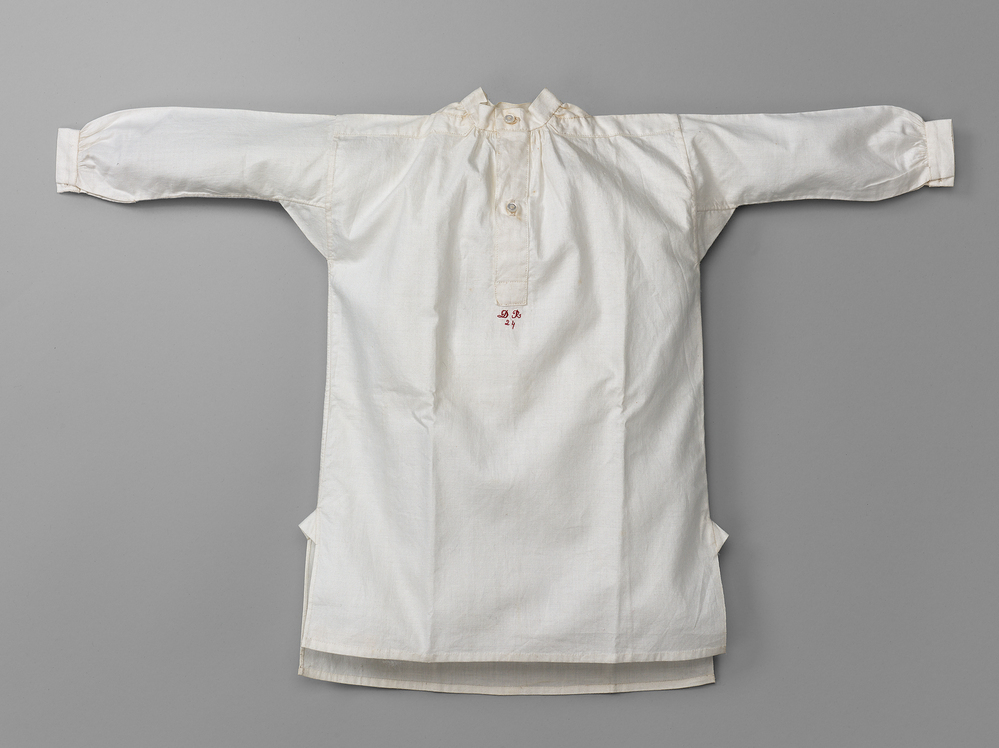 Miniatuur mannen hemd van wit katoen. Hoge ronde hals met opstaand boordje. Met middenvoor een split sluitend met twee parelmoeren knopen. Hieronder in rood geborduurd: 'D R 24'. Rechte opgestikte schouderpasjes, tegen het boord driehoekige stukjes ingezet.