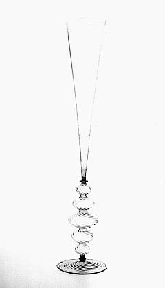Helder kleurloos glas. Licht conische voet. Basisschijf. Holle stam met vijf knopen en schijf. Voet en stam met gedraaid, in de vorm geblazen ribbelpatroon. Hoge conische kelk.