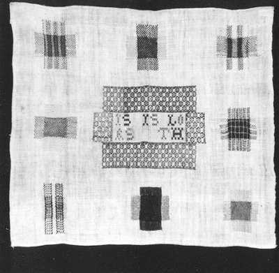 In het groene middenkader van deze stoplap zijn vijf paar initialen geborduurd; daaromheen acht kruisvormige stoppen in verschillende patronen. De initialen vertellen niets over de herkomst van de doek. De hoofdletter A is op dezelfde wijze geschreven als de typische letter A op Friese doeken, maar één “Friese A” maakt nog geen Friese doek.