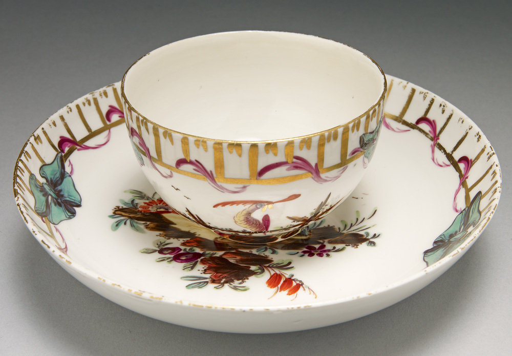 Veelkleurig beschilderde kop en schotel. De schotel met in het midden een vogel op een tak, de rand versierd met een gouden bies, strikken en paarse bloemslinger. Merk: Twee gekruisde degen met drie bollen.- Trefwoorden