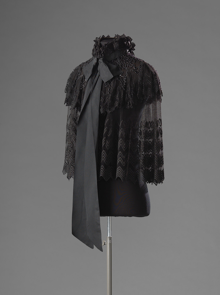 Modieuze zwarte cape, gedragen over avondkleding, met een opstaande boord en lange linten als sluiting. Middenachter een strik op de opstaande boord. Onder de boord een applicatie. de hals een originele lus. De onderkant van de cape is mogelijk afgeknipt.