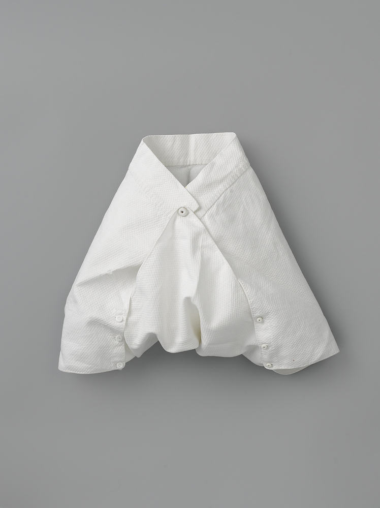 Schuin geknipte lap stof welke aan de onderkant in een punt geknipt is. De punt wordt tussen de benen door naar voren gehaald en wordt op zodanige wijze d.m.v. knoop en knoopsgaten gesloten dat de vorm van een broek ontstaat. De tailleknoop en de drie knoopjes aan de achterzijde van het broekje zijn met de hand gefestonneerd. De drie knoopjes op de linkerzijde zijn van glas.