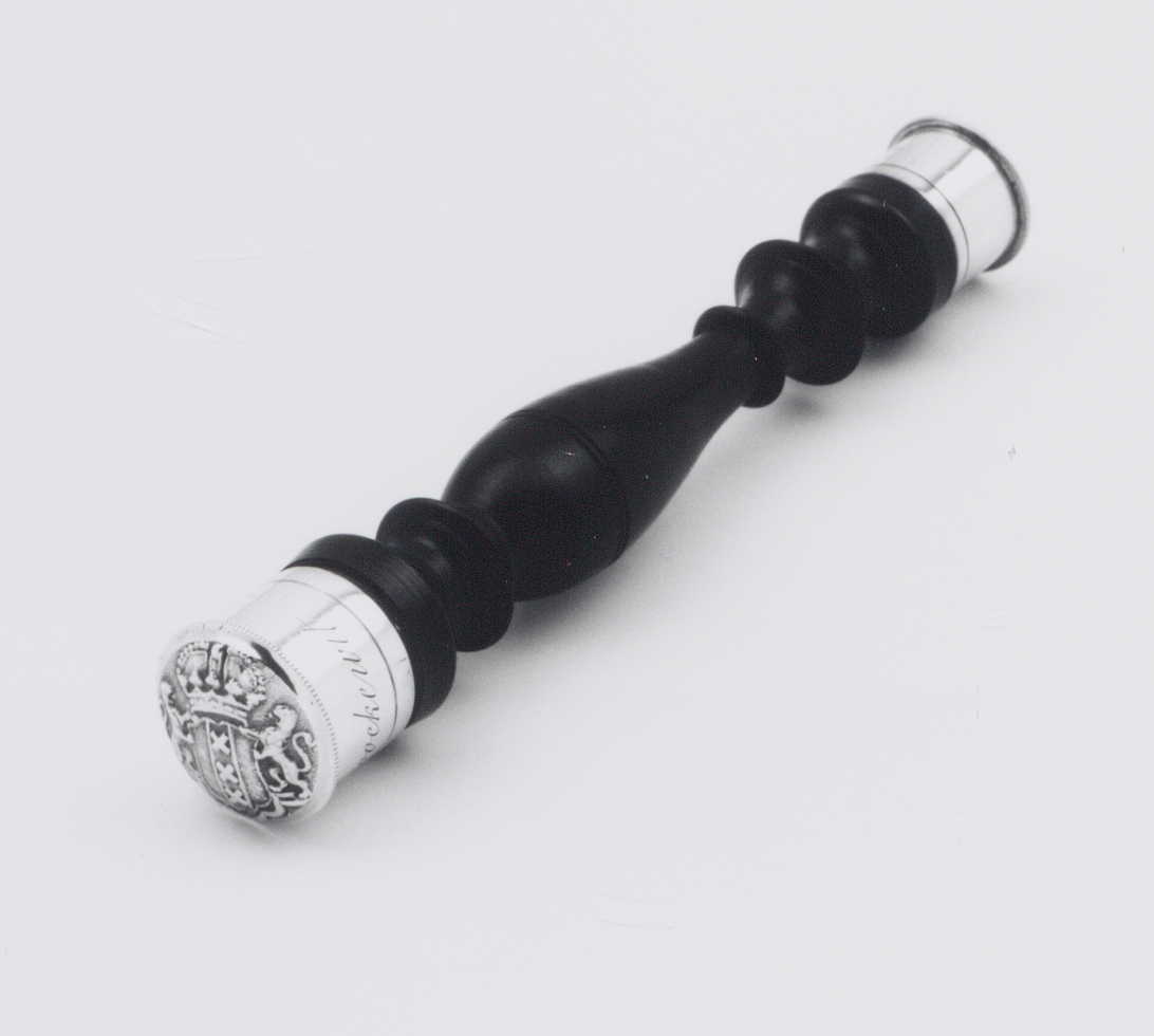 Balustervormig, geprofileerd ebbenhouten stokje met breed en smal uiteinde, elk gevat in een cilindervormige dop van zilver. Beide doppen met licht-gebolde bovenzijde en wand met een vlakke, uitstekende bovenrand en gegroefde rand langs onderzijde. Bovenzijde grote dop met in reliëf op een geruwde ondergrond het gekroonde wapen van Amsterdam, gehouden door twee leeuwen. Op wand is gegraveerd: Jan Hendrik Croockewit/. Bovenzijde kleine dop met in reliëf op een geruwde ondergrond de letters: MKRS/ in monogram (medeklinkers in het woord makelaars) binnen parelrand. Op wand is gegraveerd: 1837/.