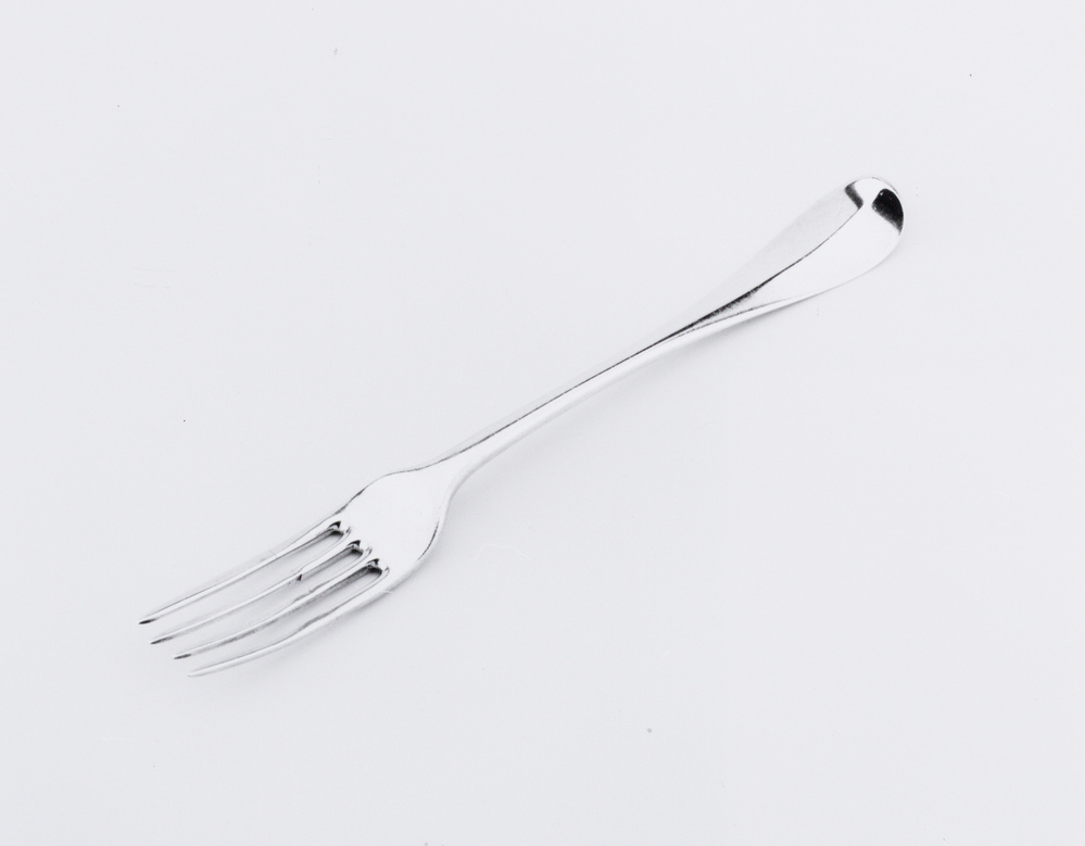 Tafelvork, steel met middenribbe en ronde opstaande kop, enkel lof.