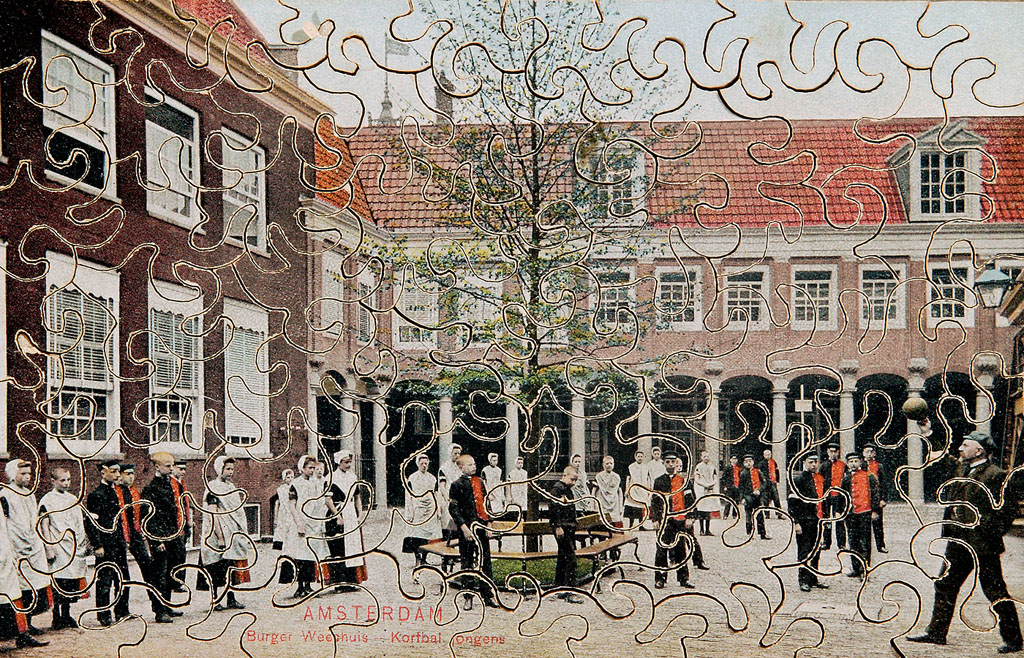 Deze legpuzzel is gemaakt uit een ansichtkaart (1904) van de jongensbinnenplaats van het Amsterdamse Burgerweeshuis (huidige Amsterdam Museum). Onderwijzer Jan Stam legt de spelregels van korfbal uit. Korfbal was omstreeks 1900 nieuw. Jongens en meisjes sporten in een gemengd team. Stam toont hiermee zijn moderne ideeën over onderwijs en opvoeding. ( Annemarie den Dekker)