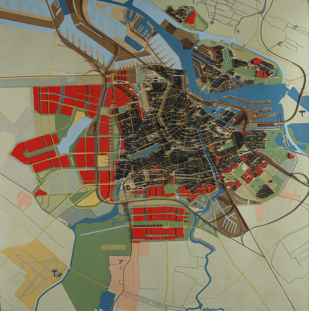 De oude stad, de 19de-eeuwse wijken en Berlages plan Zuid uit de jaren 1920-1940, zijn op deze maquette in zwart uitgevoerd. Het Algemeen Uitbreidingsplan (AUP) dat grotendeels na 1945 werd uitgevoerd, is in rood aangegeven. Het AUP werd gepresenteerd als een plan dat vooruitliep op de groei van de stad tot het jaar 2000. De traditionele cirkelvormige stadsuitleg kwam met het AUP ten einde. Hiervoor in de plaats kwam een structuur van lobben of vingers die ruimte liet voor veel groen en water. Het plan bracht een scherpe scheiding aan tussen wonen, werken, verkeer en recreatie. In het AUP zijn de woningen in stroken gebouwd met daartussen open ruimte. Dit in tegenstelling tot de oude ‘gesloten’ blokken met binnentuinen.