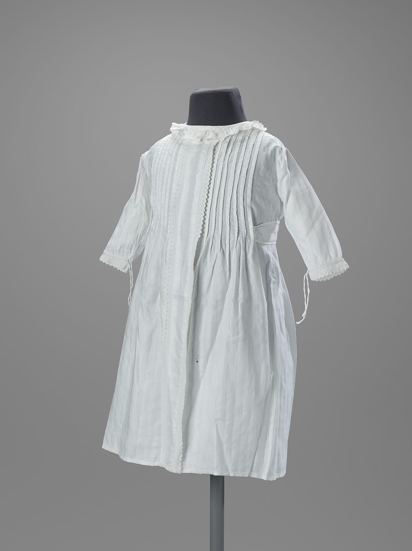 Witte katoenen nachtpon voor een baby met ingeweven streep. Voorpand is uit één stuk geknipt. Middenvoor een dubbele strook Engels borduursel in de lengterichting, aan weerszijden zes kleine naaldplooien van schoudernaad tot iets boven de taille, waardoor wijdte in de rok ontstaat. Achterpand heeft een kort pasje met aangerimpelde rok; langs de hals een strook gerimpeld Engels borduurwerk. Lange mouwen, afgewerkt aan de pols met Engels borduurwerk en een koordje om de mouwen passend te maken. Twee linten vastgezet aan de laatste ingestikte plooi op het voorpand, welke dienen om middenachter gestrikt te worden.