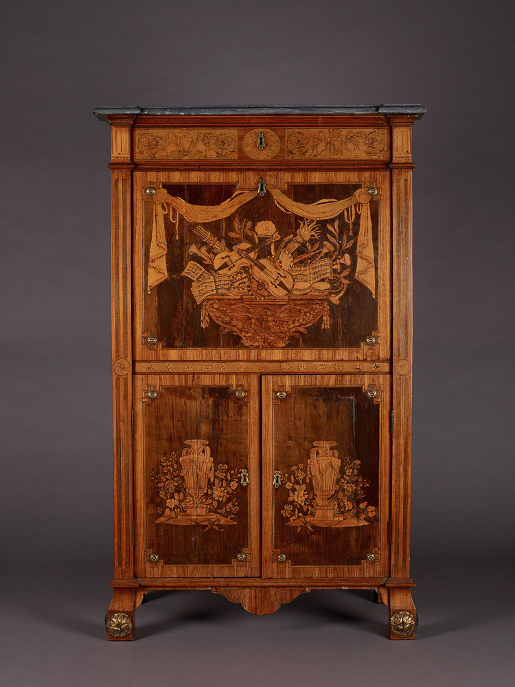 De klep is versierd met inlegwerk van vazen, muziekinstrumenten en bladmuziek. De vazen zijn ontleend aan een prent uit 1765 van Maurice Jacques (1712-1784). ( Jacqueline Grandjean)