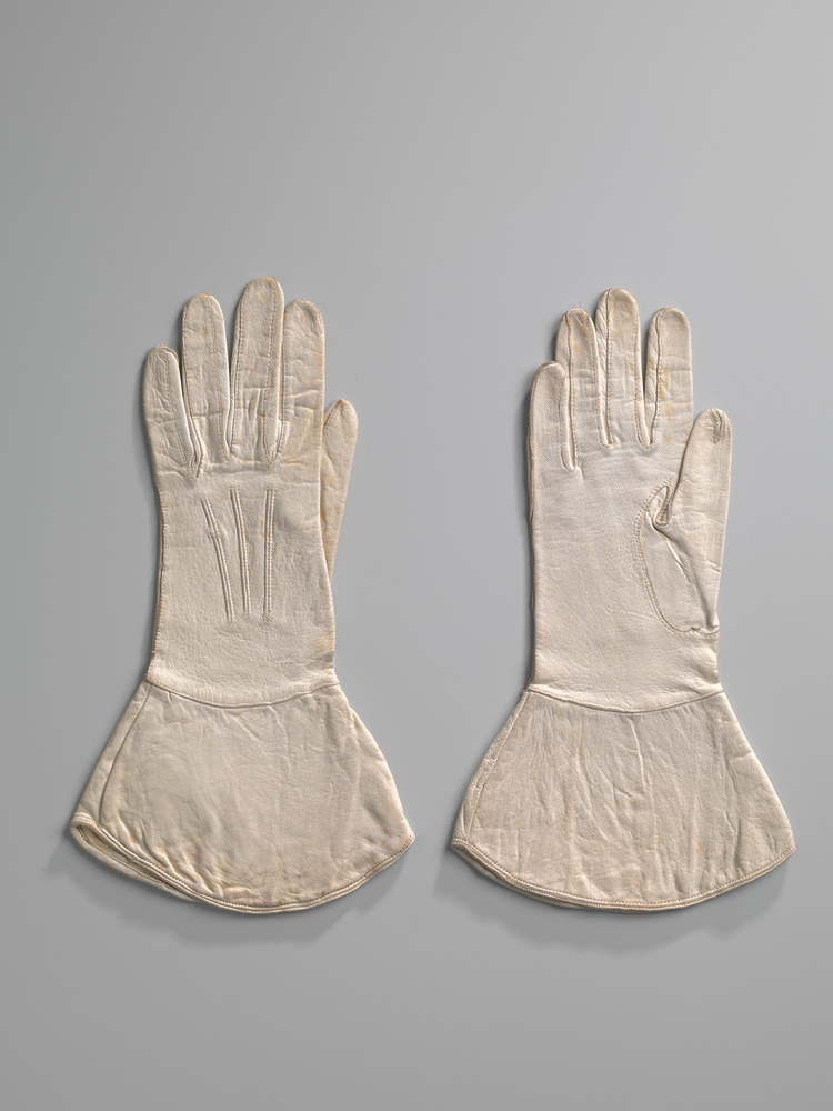 Een paar witte leren dameshandschoenen met kappen, bedoeld om paard mee te rijden. Op de rug drie sierstiksels.