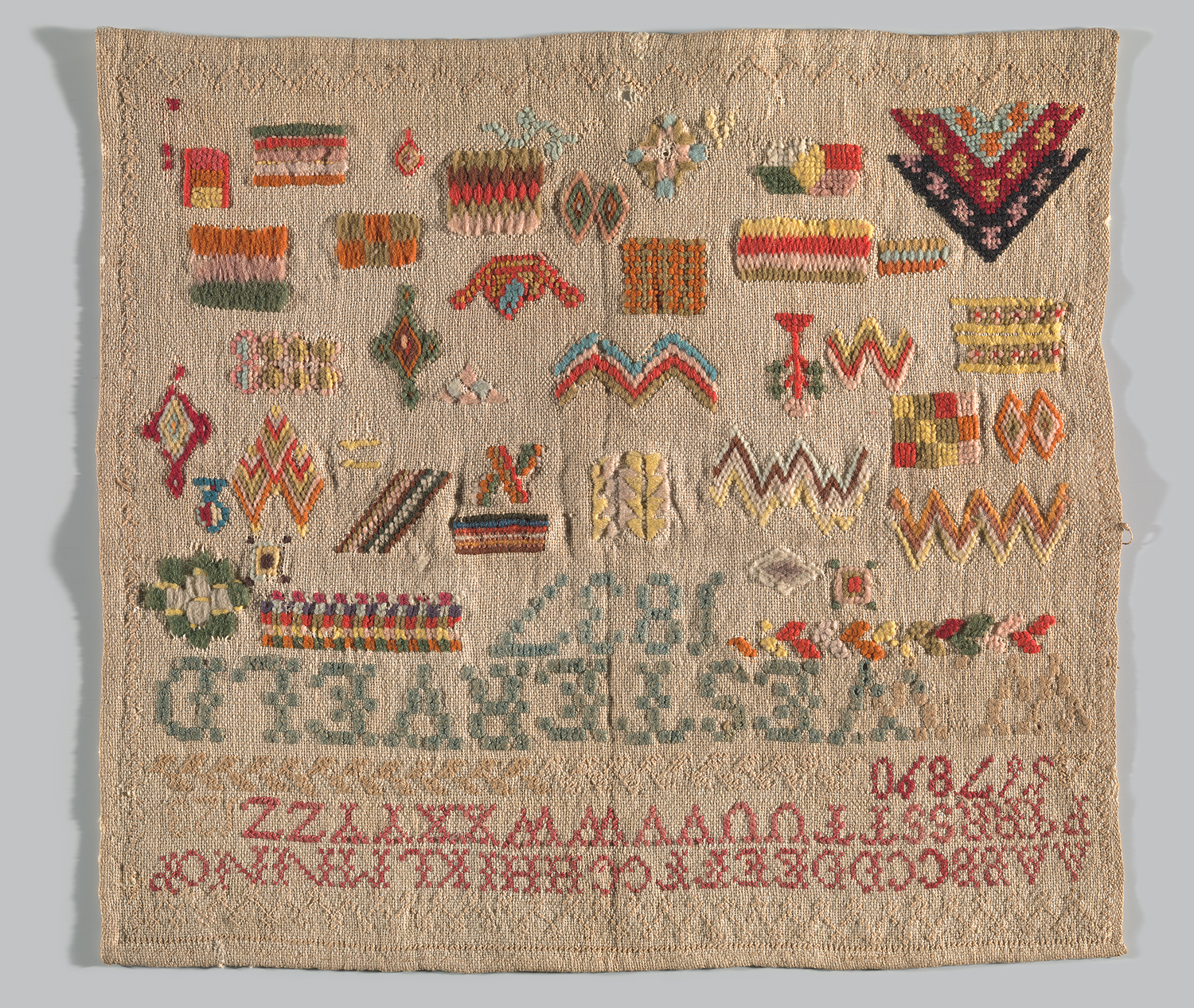 Wilhelmina draagt met één letter- en stekenlap bij aan de collectie van het museum. Deze doek is een niet vaak voorkomende combinatie van een merk- en een stekenlap. Wilhelmina opent met een alfabet waar ze ogenschijnlijk willekeurig letters herhaalt of juist niet herhaalt. De reeks in Romeinse kapitalen eindigt met een cijferreeks. Dan volgt haar naam over de volle breedte van de doek. Op de volgende regel vermeldt ze het jaar waarin de doek voltooid is: 1837. Wilhelmina maakt hierbij gebruik van de stersteek. Het resterende deel is gevuld met onregelmatig geplaatste kleine en grotere proefjes in tapisseriesteek, voornamelijk geometrische patronen uitgewerkt in wol op een katoenen stramien. Door afzonderlijke motiefjes te herhalen en op elkaar aan te laten sluiten ontstond één groot, doorlopend, patroon. Vooral in de tweede helft van de achttiende eeuw werd deze techniek met zijden op linnen toegepast. Er werden schoenen, tasjes, boekomslagen en andere luxe voorwerpen accessoires mee bekleed. Dit handwerk werd door oudere meisjes uitgevoerd, voornamelijk door Franse kostschoolmeisjes, maar ook door andere meisjes die de opdracht daartoe kregen. De patronen met wollen garen dienden evenals die met zijde om het hele vlak te vullen. Er waren twee mogelijkheden, de patronen herhaalden zich of één patroon stond uit tegen een achtergrond. Met dergelijk grover borduurwerk werden onder andere schoenen, tasjes, stoelen, voetenbankjes, schellekoorden en reistassen gedecoreerd. Bij één enkel motief werd de hele achtergrond met één kleur ingevuld. Dat was ongetwijfeld een saai werkje.