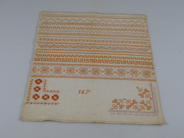 Tussen de werkjes die Grietje gemaakt heeft, bevindt zich een stekenlap. De doek die 33 x 27 cm meet is gevuld met allerlei sierrandjes, die onder de noemer Holbeinsteek vallen.