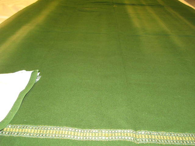 Groen gordijn met zeven plooien, met beige katoen gevoerd, onderrand afgezet met band.- Trefwoorden