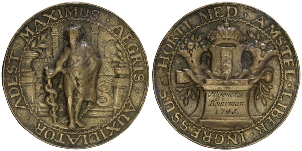 voorzijde: Aesculapius met zijn staf; achter hem een gebouw, links en rechts vazen met planten. Voorzien van een omschrift.
