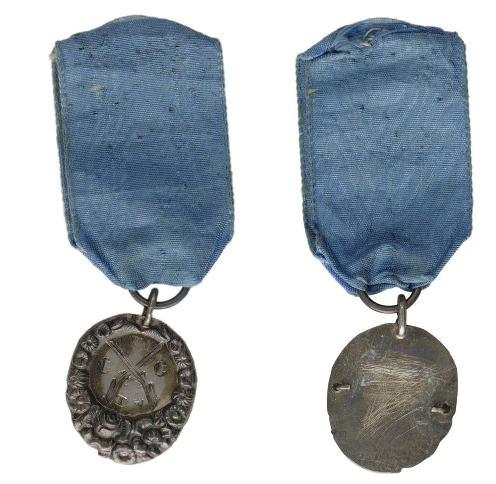ovaal éénzijdige penning als draagteken, onderaan een bloemenkrans die langs de randen naar boven toe uitloopt rond een cirkel waarin gegraveerd twee gekruiste geweren en de letters G G D V. Bovenaan een ring met oog waaraan een lichtblauw zijden lint.