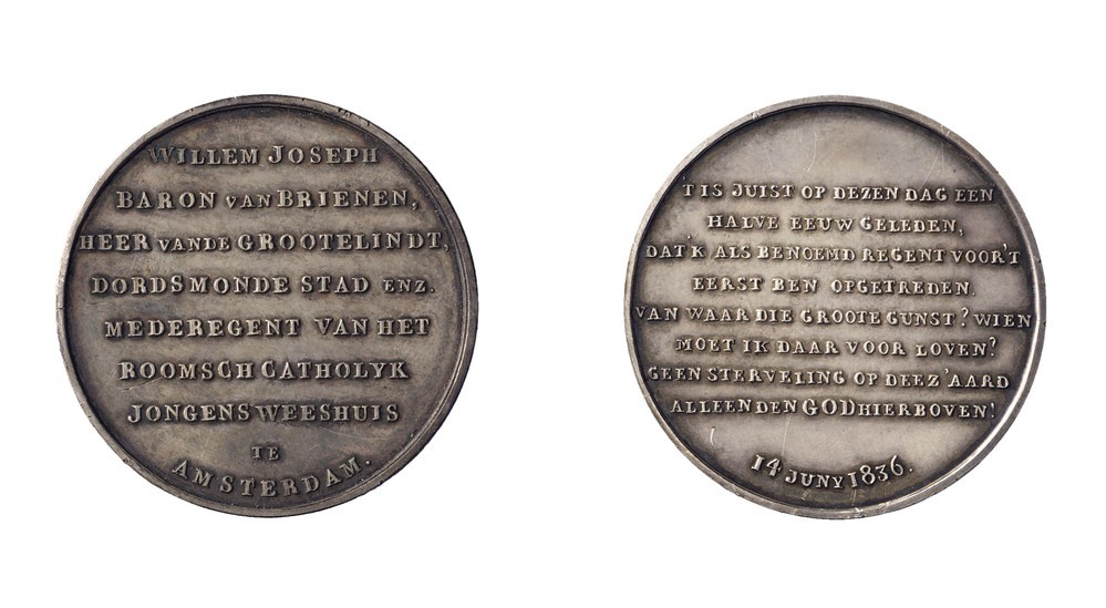 opschrift voorzijde: WILLEM JOSEPH / BARON VAN BRIENEN, / HEER VAN DE GROOTELINDT, / DORDSMONDE STAD ENZ. / MEDEREGENT VAN HET / ROOMSCH KATHOLYK / JONGENSWEESHUIS / TE AMSTERDAM.