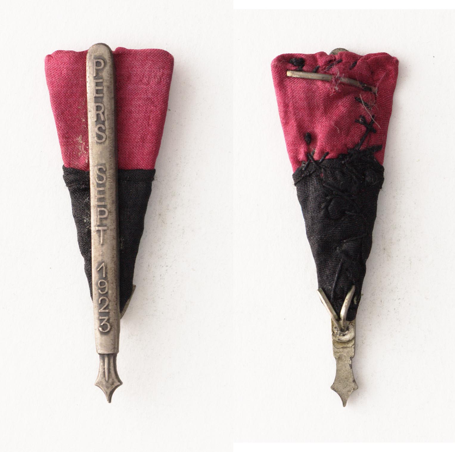 onbekende verwerving inv.nr. PA 1938 in depot Eenzijdig draagteken in de vorm van een zilveren vulpenhouder met van boven naar beneden het opschrift "pers sept 1923" op driehoekig rood-zwart lint
