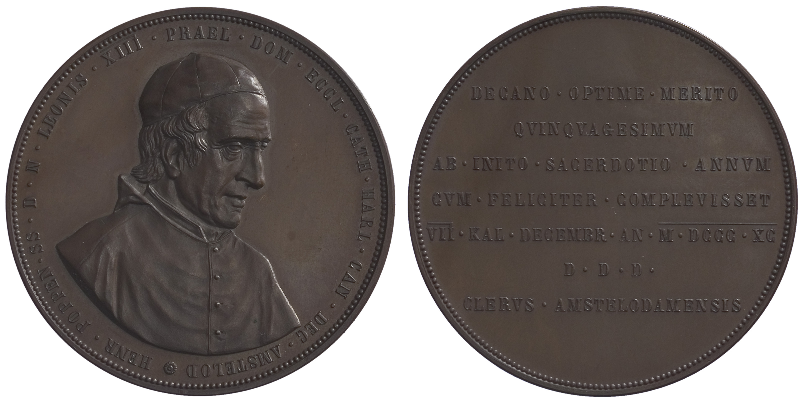 opschrift keerzijde: DECANO . OPTUME . MERITO / QUINQUAGESIMUM / AB.INITO.SACERDOTIO.ANNUM / CUM.FELICITER.COMPLEVISSET / VII.KAL.DECEMBR.AN.M.DCCC.XC / D.D.D. / CLERUS.AMSTELODAMENSIS.