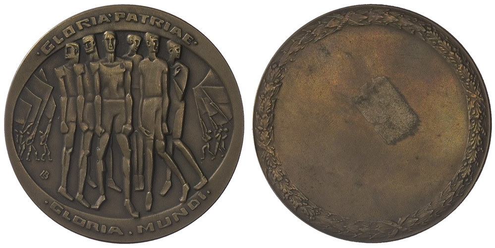 voorzijde: in een omschrift staan zes stylistisch uitgevoerde atleten, met links en rechts een groep vaandeldragers. keerzijde: een eikenloof- lauwerkrans met daarbinnen een leeg veld.- Trefwoorden
