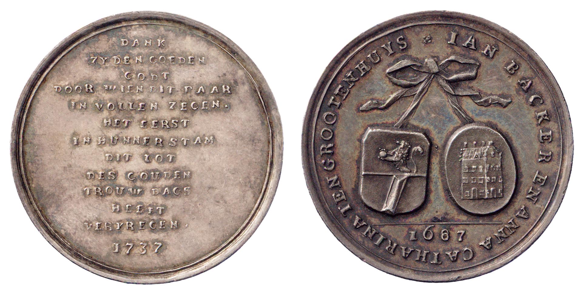 opschrift keerzijde: dank / zy den goeden / Godt / door wien dit paar / in vollen zegen / het eerst / in hunner stam / dit lot / des gouden / trouw dags / heeft / verkregen / 1737