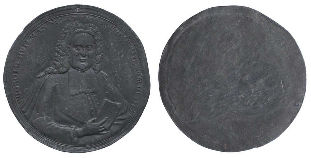 - omschrift voorzijde: WICHBOLD MUILMAN, Nat. Amit. 19 Aug. 1674. Ob. Hao. 29 Mart. 1716.