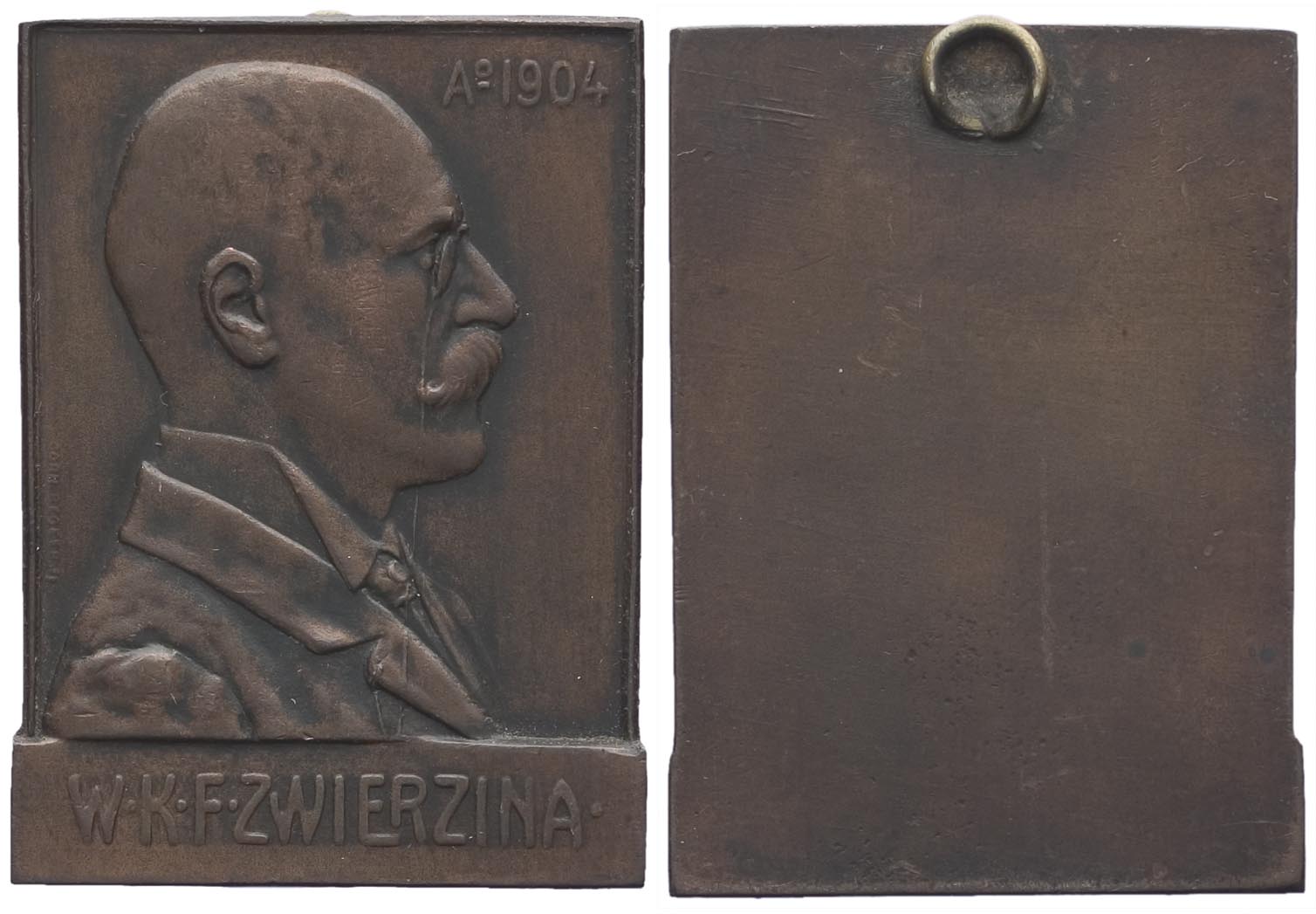 voorzijde: staande rechthoekige penning met een buste naar rechts van W.K.F. Zwierzina. Boven en onder een opschrift. keerzijde: onbewerkt, met aan de bovenkant een ring.