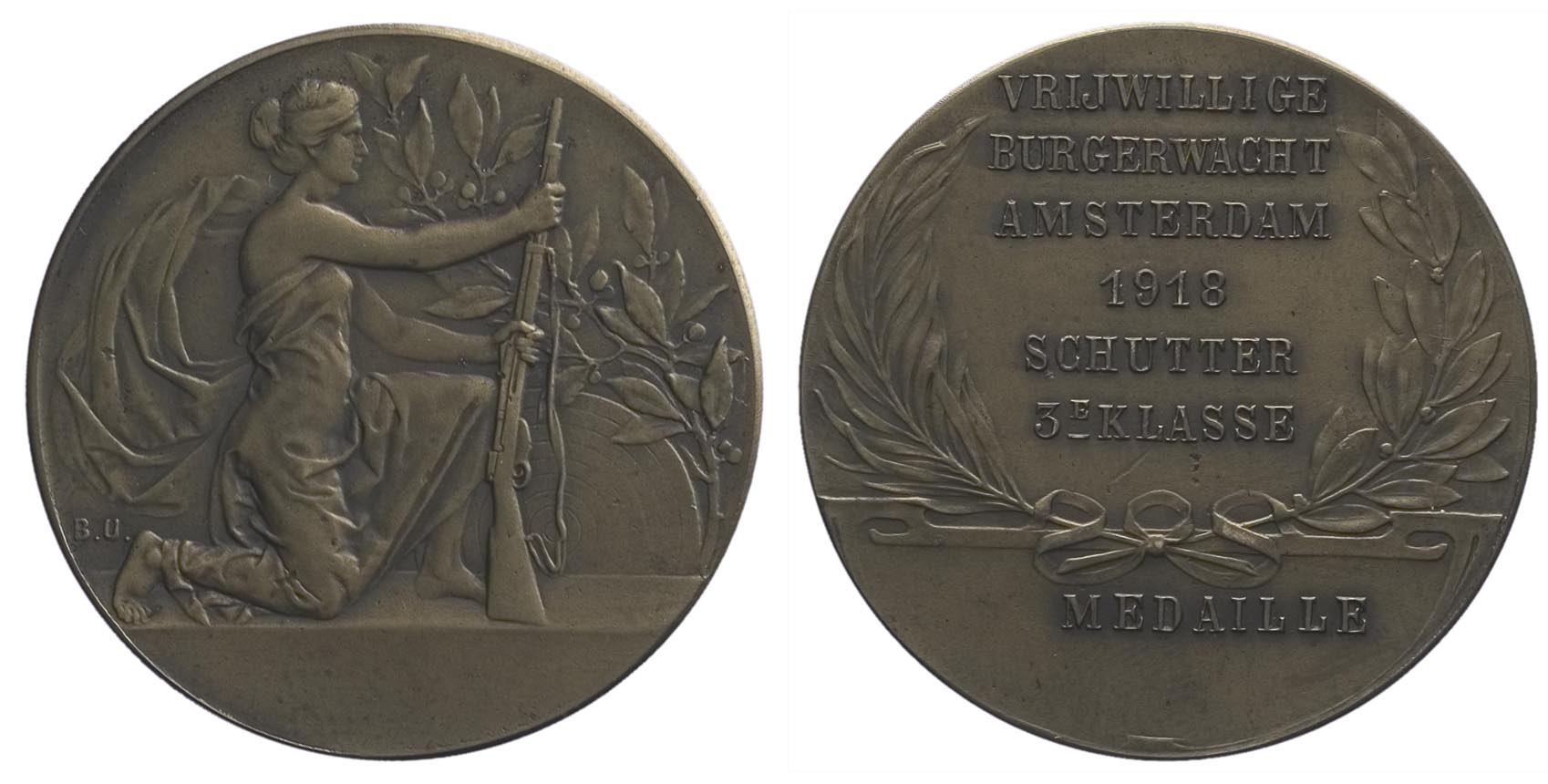voorzijde: rechtsgewende, geknielde vrouwenfiguur met twee handen aan een geweer voor een schietschijf en een lauwertak. Linksonder een signatuur.