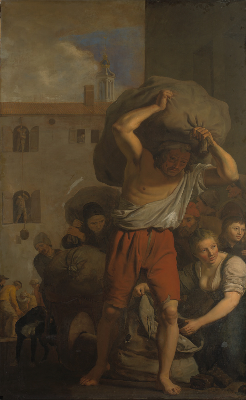 Een man levensgroot, met rode kniebroek en naar omlaag gezakt licht hemd, met grote, gevulde zak op de schouders. Daaromheen gegroepeerd: oude vrouw met zak op de rug; kruiwagen, waarop gevulde zak, daarachter man met wollen muts op; rechts jonge vrouw met linkerhand in geopende zak. Op achtergrond pakhuis, waar werklieden een mand aan een hijstouw laten zakken.